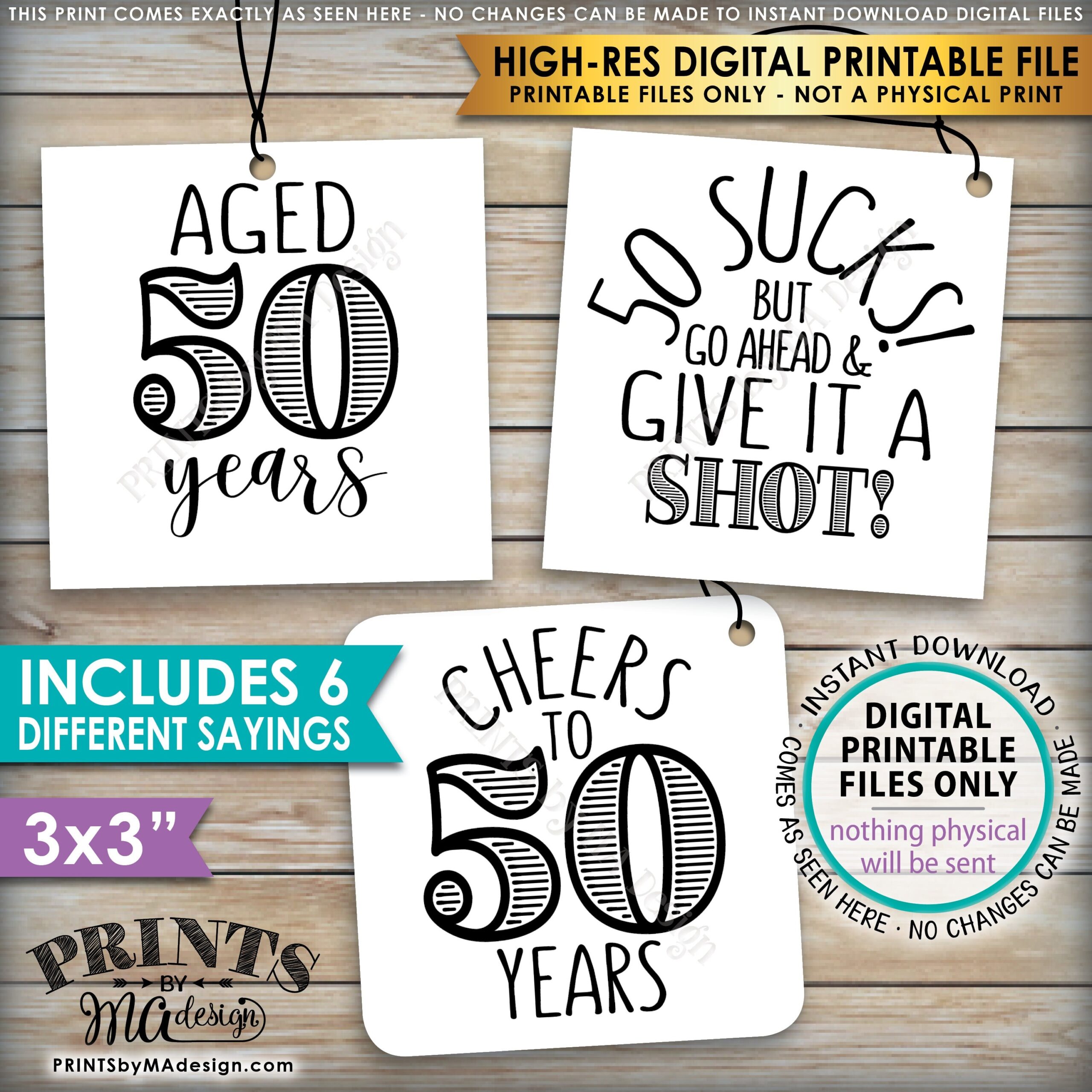 50th Birthday Party Candy Signs Color Candy Bar 50 Sucks Blows Rocks Kiss 40s Goodbye Square 3×3 Tags On PRINTABLE 8 5×11 Sheet