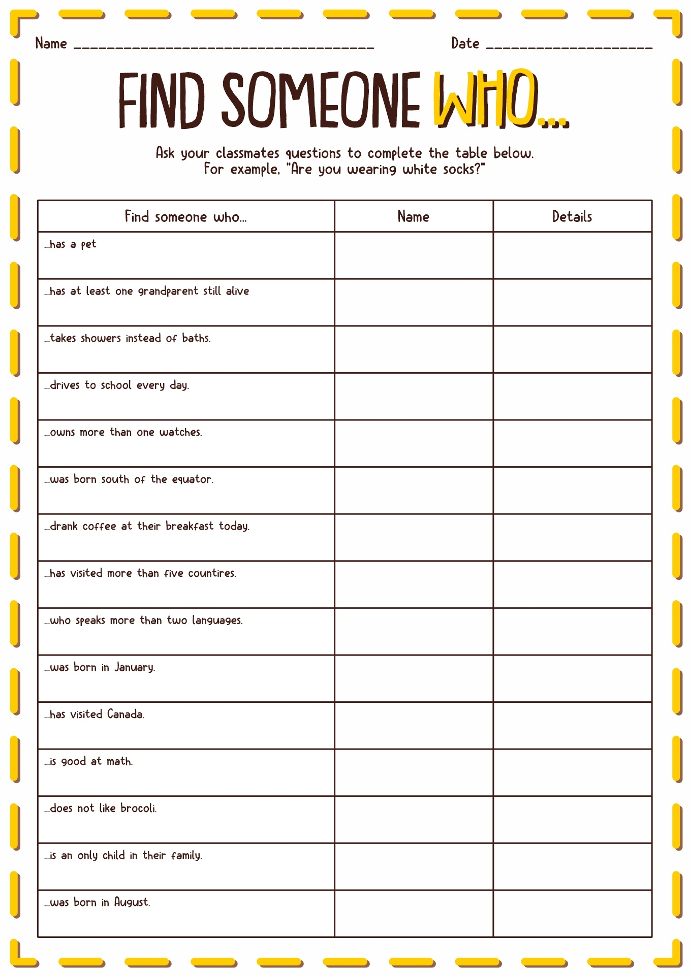Our Find Someone Who cards are designed to spark conversations and connections. Each card features a list of fun and quirky statements, such as “Find someone who has traveled to Europe” or “Find someone who can speak another language.”