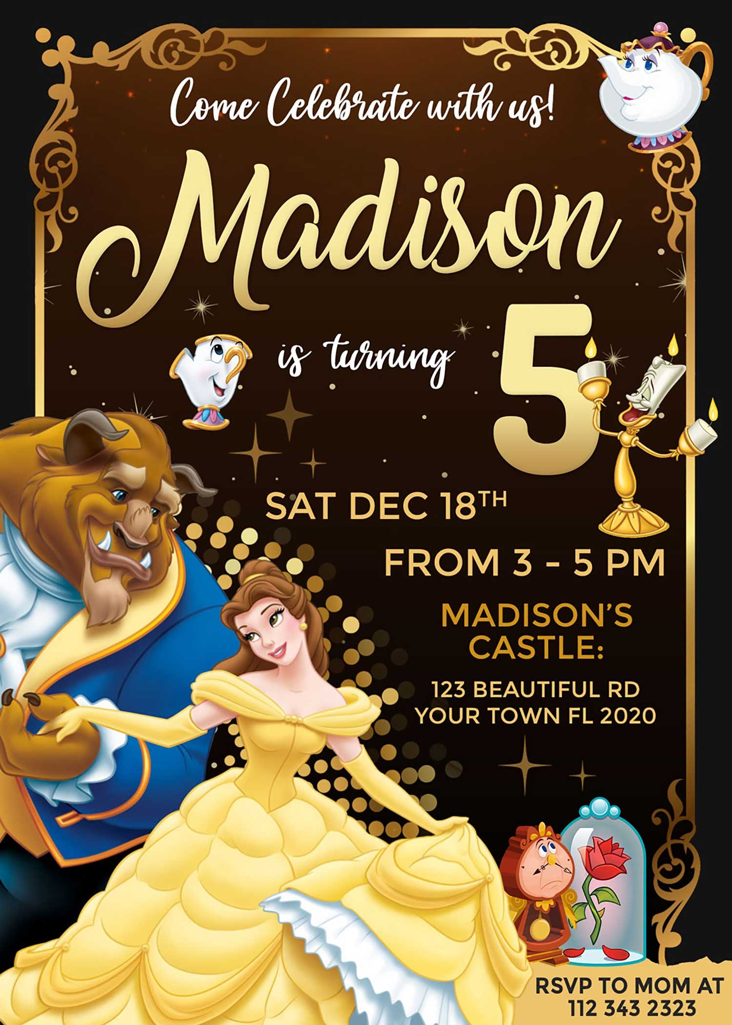 With our collection of Beauty and the Beast birthday invitations, you can easily customize and print out charming designs that will delight your guests and make your child feel like a princess or prince.