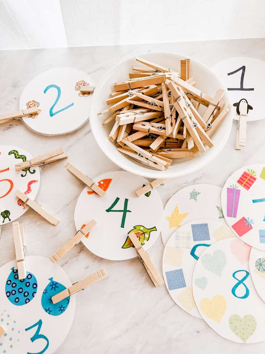 You can also create a number recognition game by printing out numbers and attaching clothespins with the corresponding number of dots. This activity is a fun way for preschoolers to practice counting, number recognition, and one-to-one correspondence.