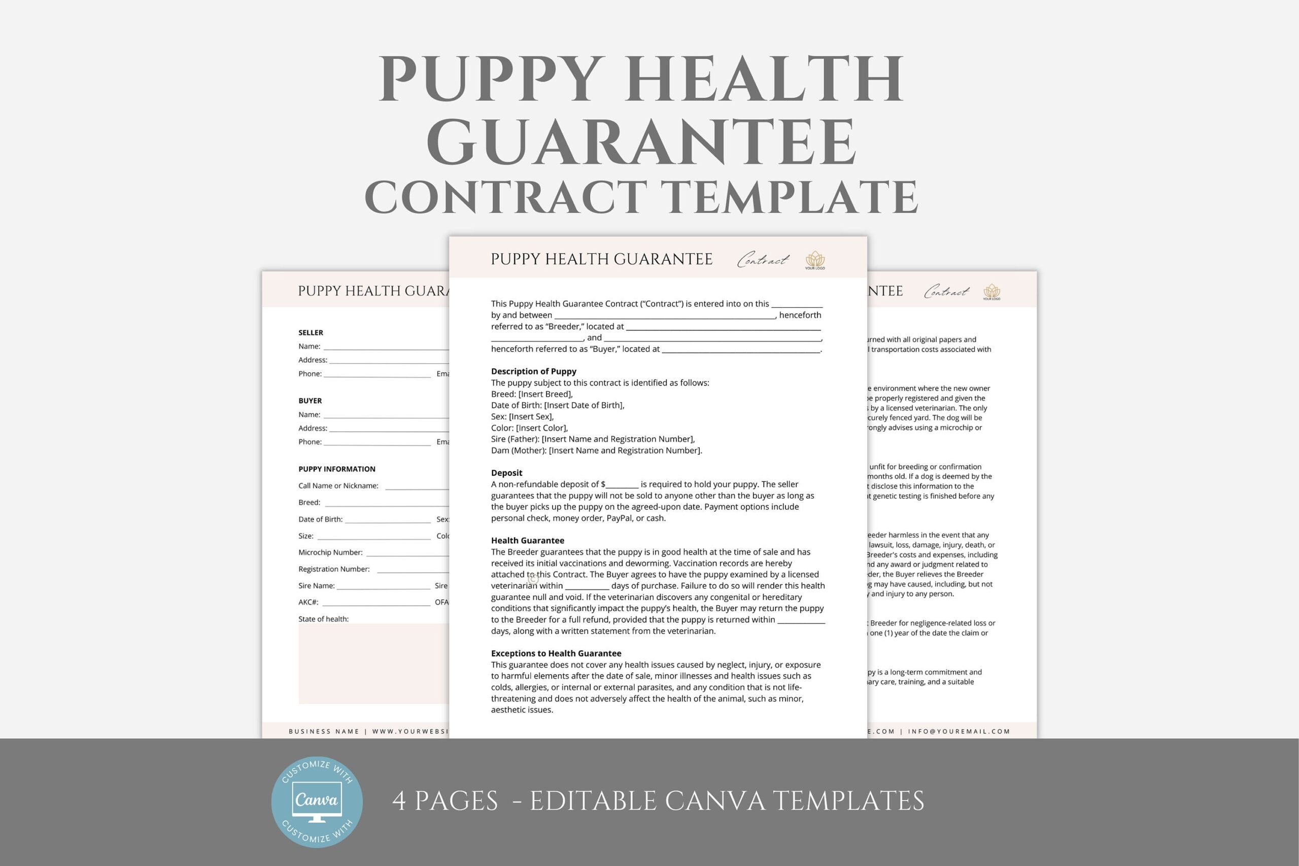 Editable Puppy Health Guarantee Contract Template Puppy Adoption Agreement Dog Breeder Contract Forms Puppy Contract Of Sale Canva Etsy