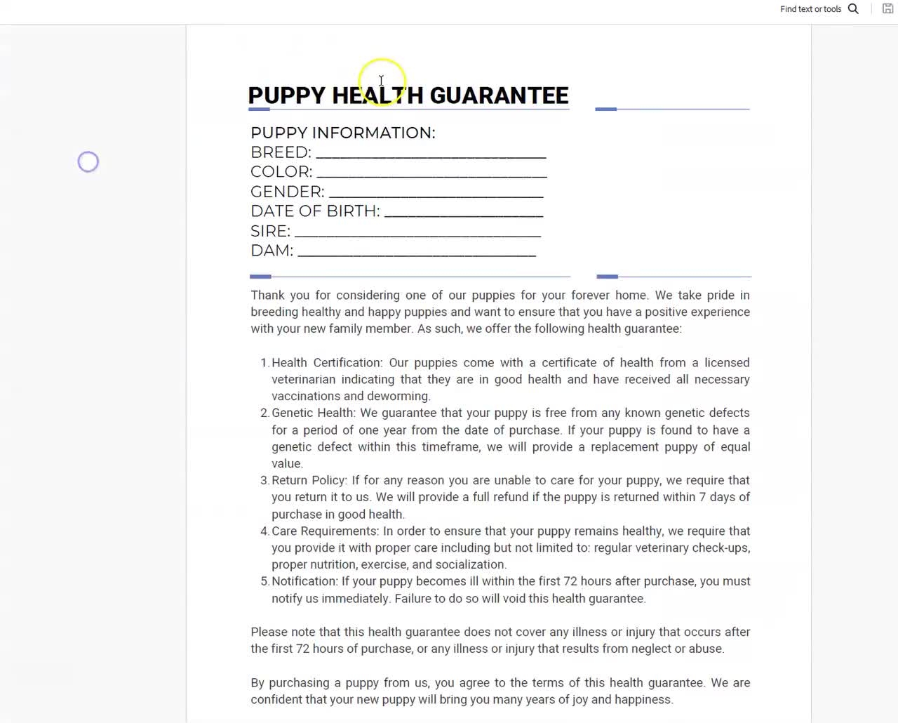 Remember, a healthy and happy puppy is a happy customer. By using our template, you’re not only protecting your business but also ensuring the well-being of the puppies you’ve worked so hard to raise. Download our template today and make a difference in the lives of both your customers and your furry friends.