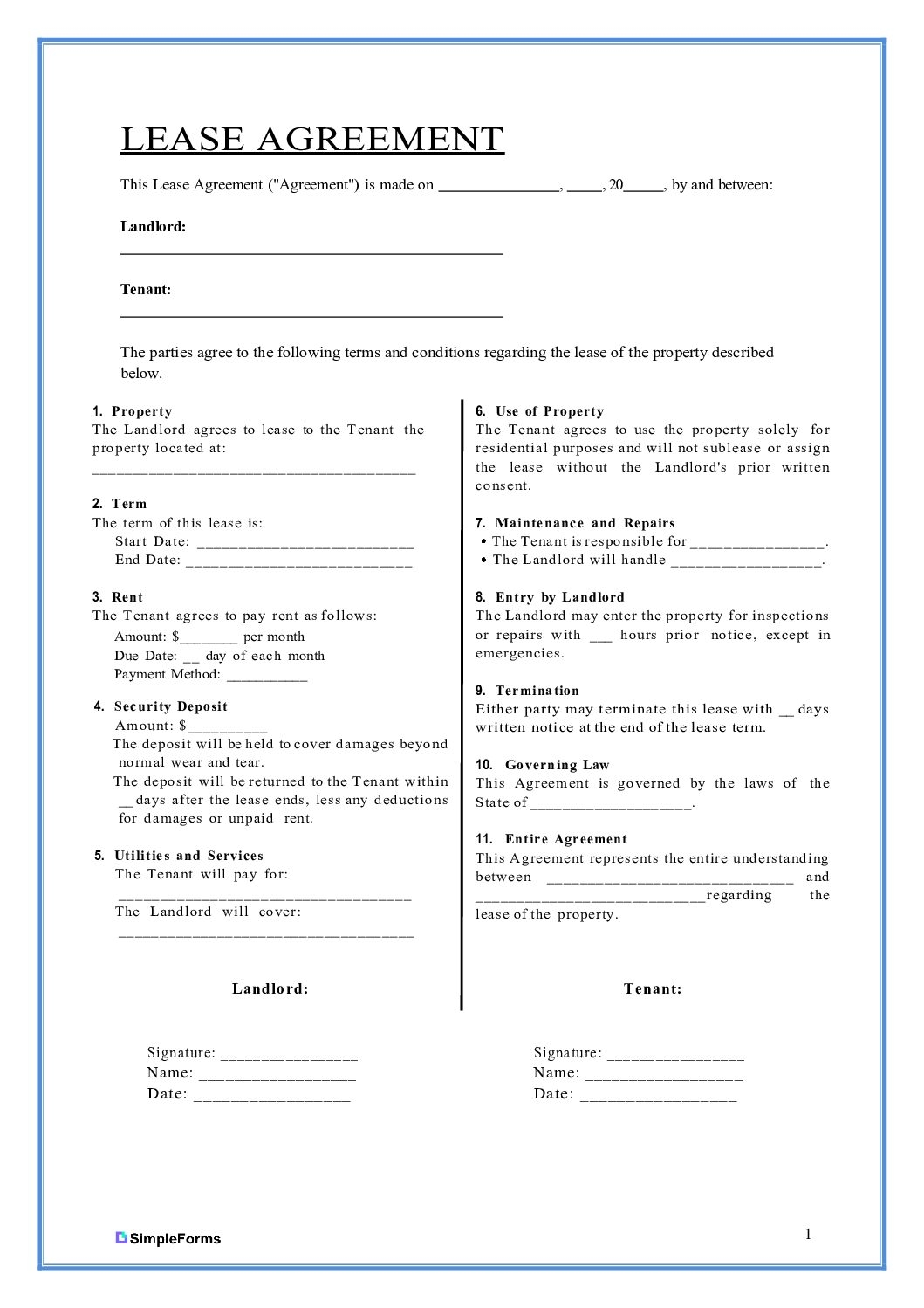 Free Simple 1 Page Lease Agreement Template Sample PDF Word EForms