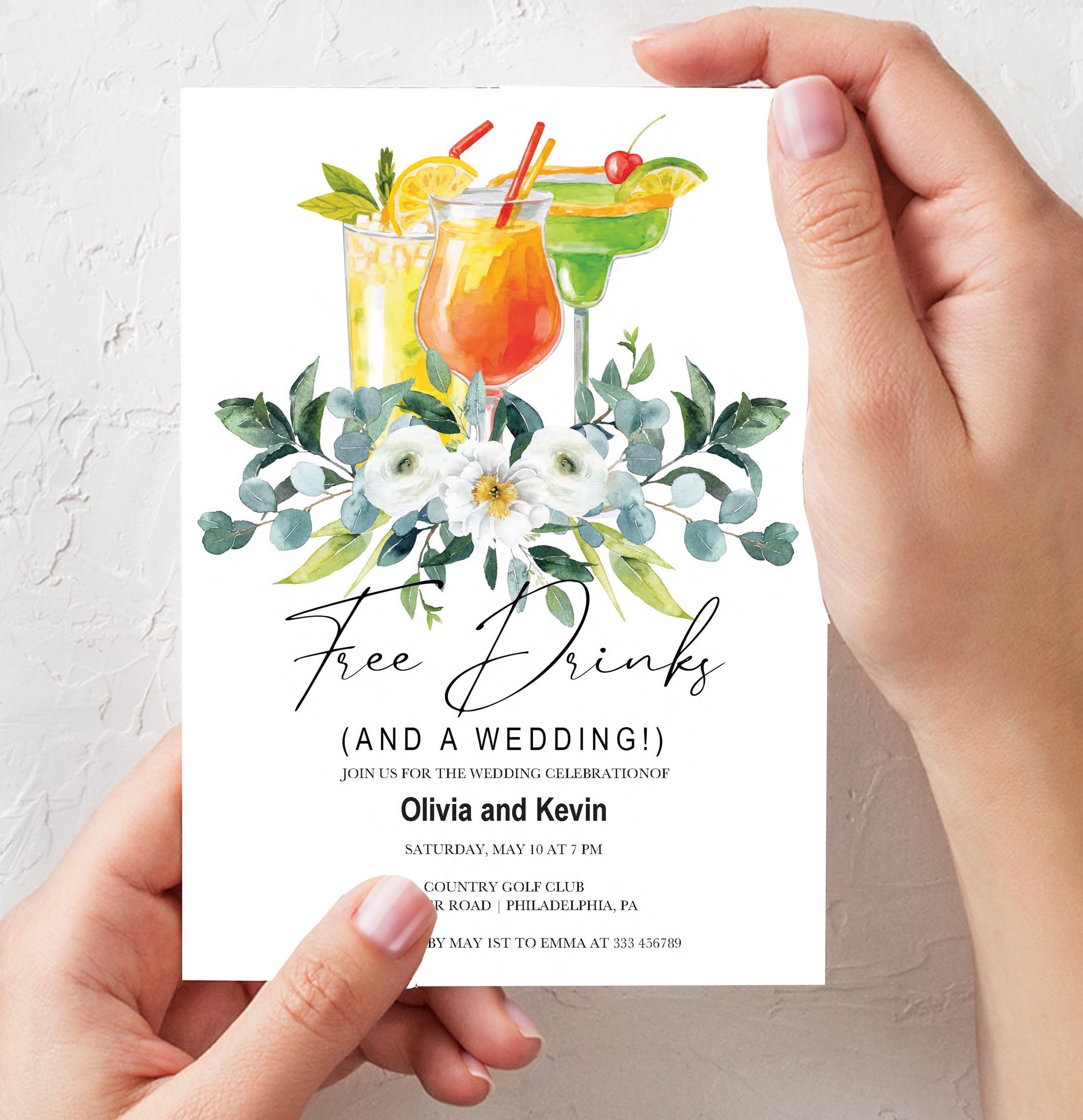 Funny Free Drinks Wedding Invitation Printable Cocktails And Flowers Watercolor Boho Invite Card Template Editable PDF