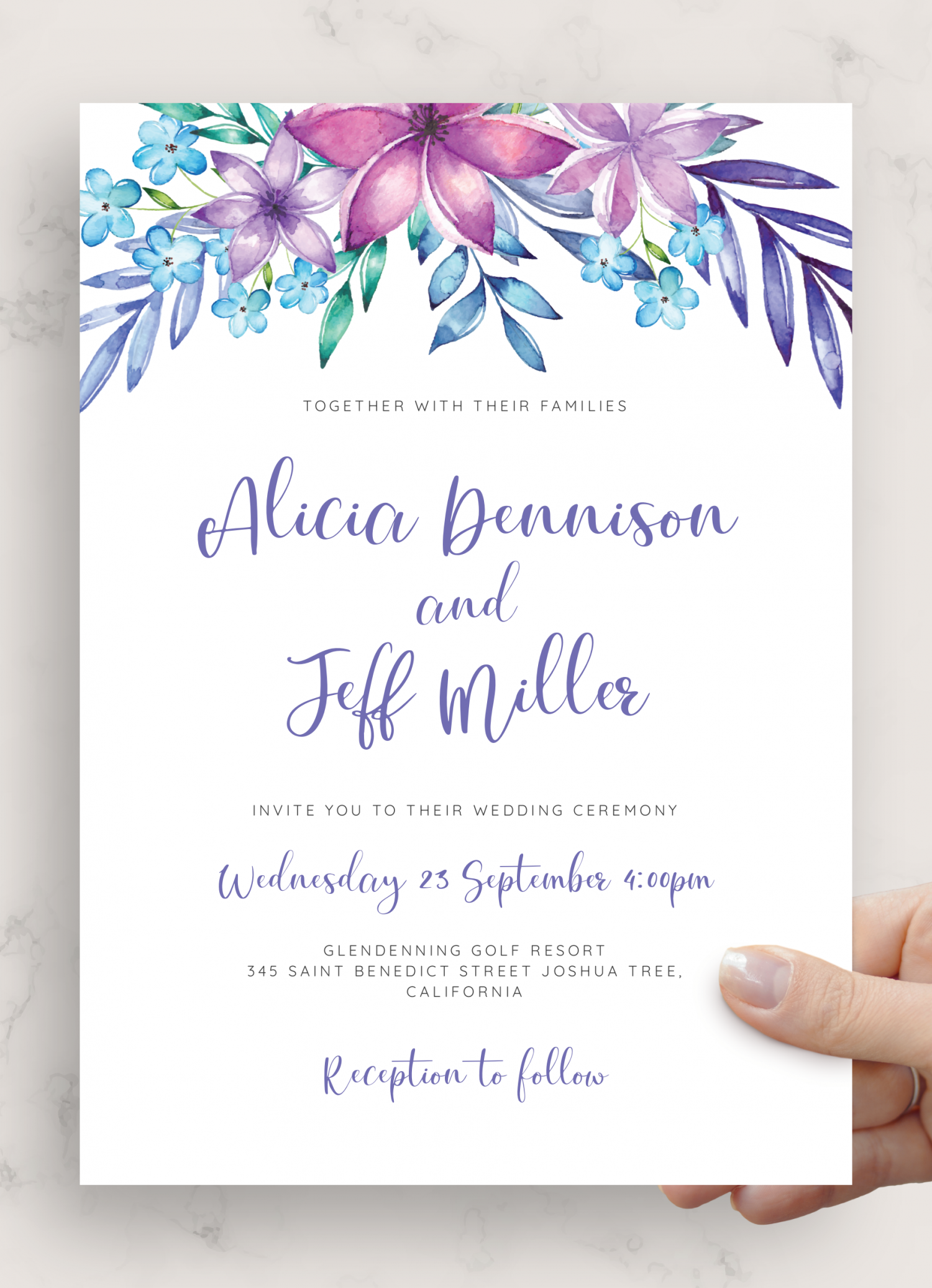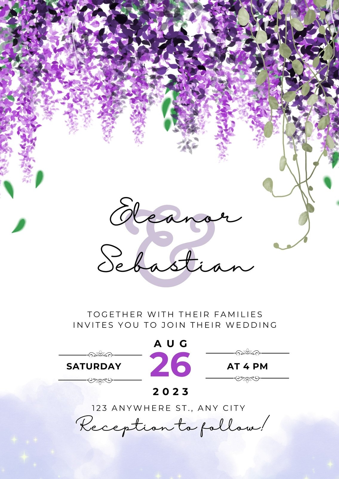 With these free wedding invitation templates, you can customize the text, fonts, and colors to match your wedding theme. From elegant lavender floral designs to modern violet patterns, there’s something for every couple’s taste.