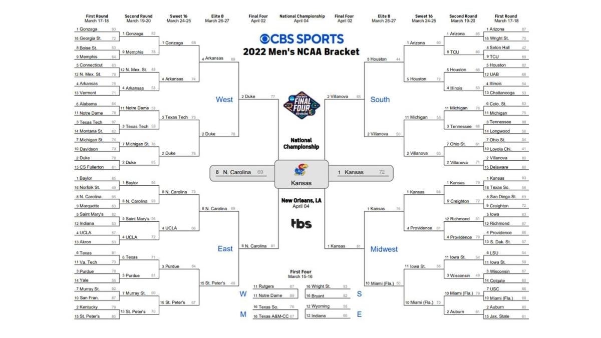 Kansas National Title 2022 Printable March Madness Bracket NCAA Tournament Champions Scores Results CBSSports