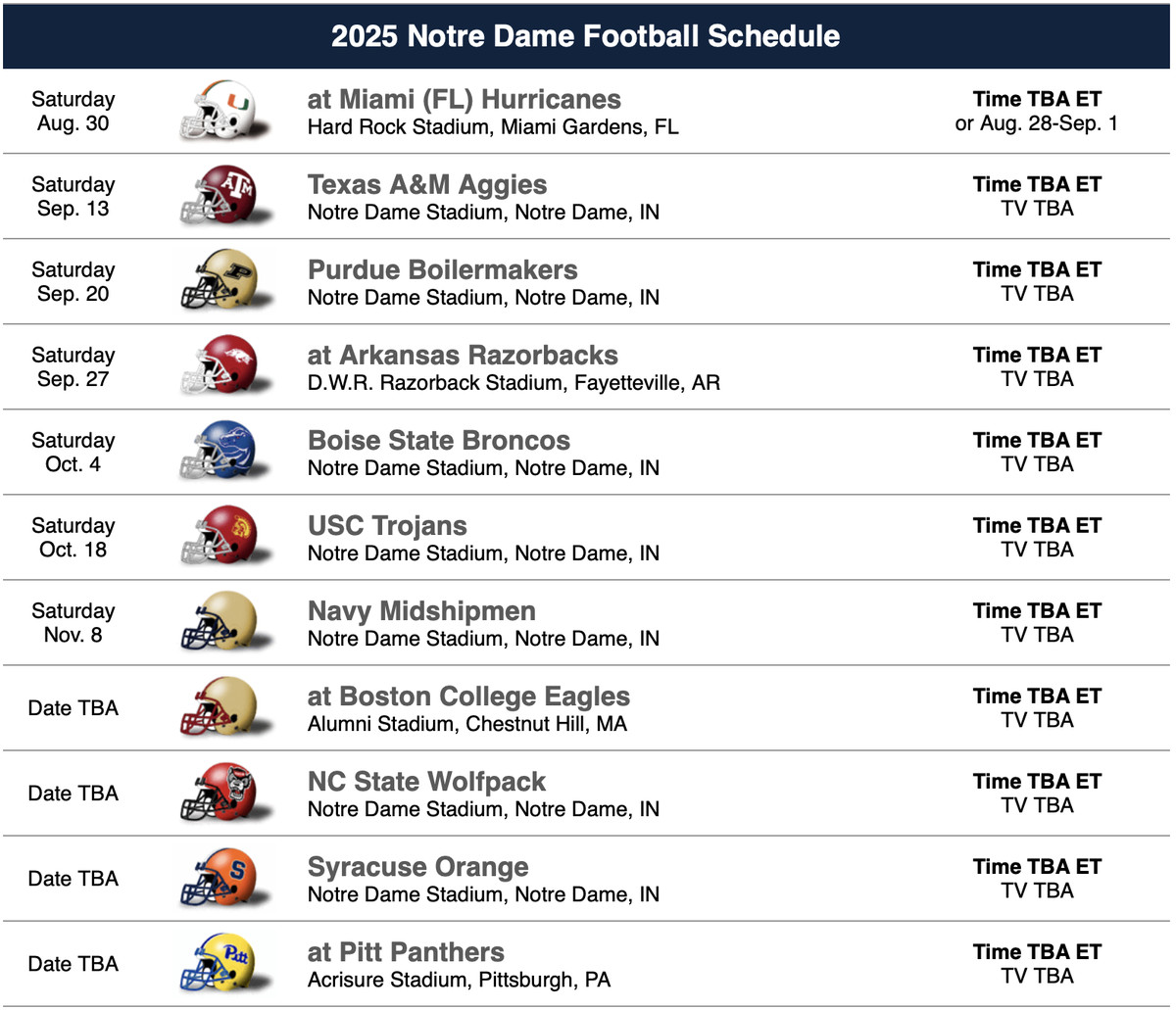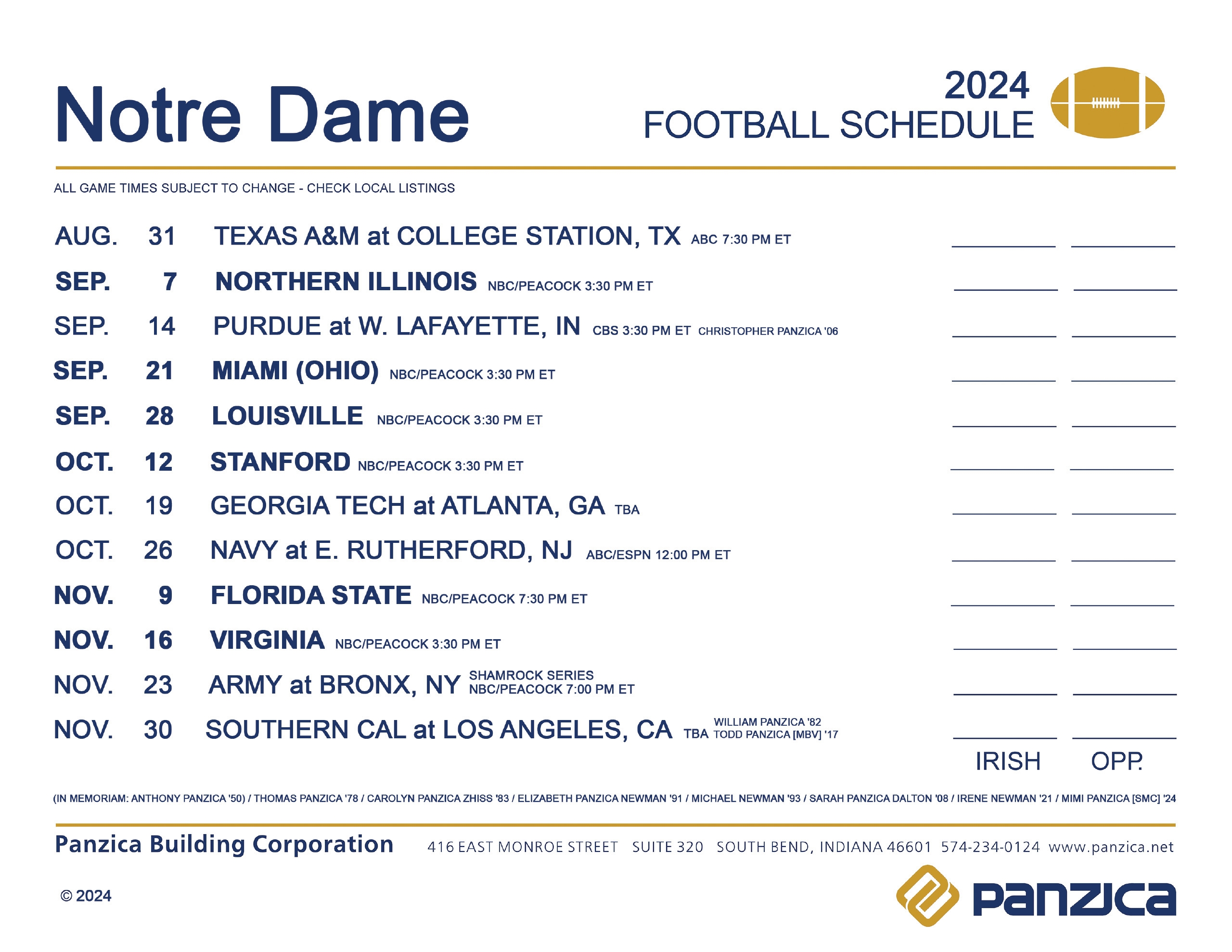 Simply click the link below to download and print your copy of the Notre Dame Football Schedule 2025. Hang it on your fridge, in your office, or take it with you on the go. Never miss a game again!