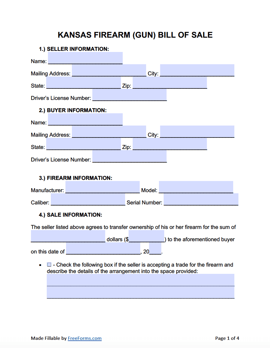 Free Kansas Firearm Gun Bill Of Sale Form PDF Word