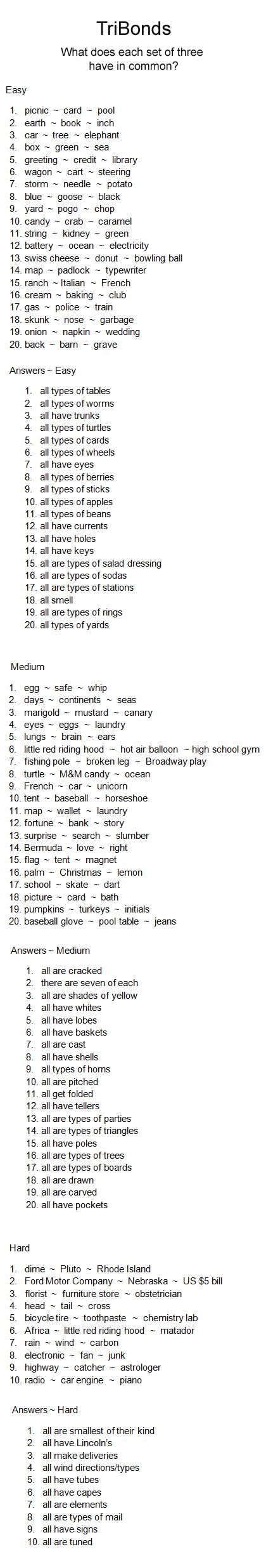 TriBond Three Words With A Common Bond Easy Medium And Hard TriBonds With Answers