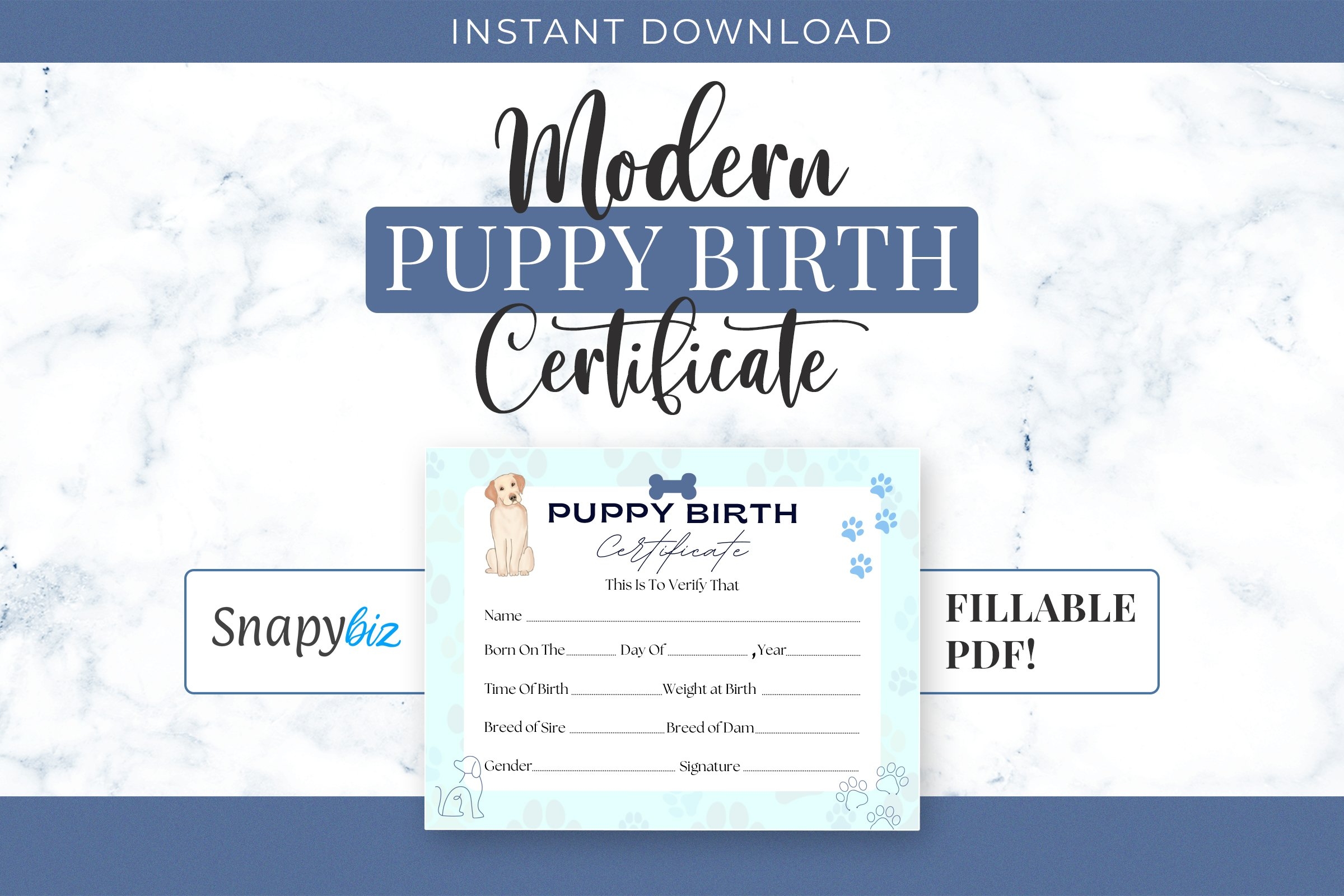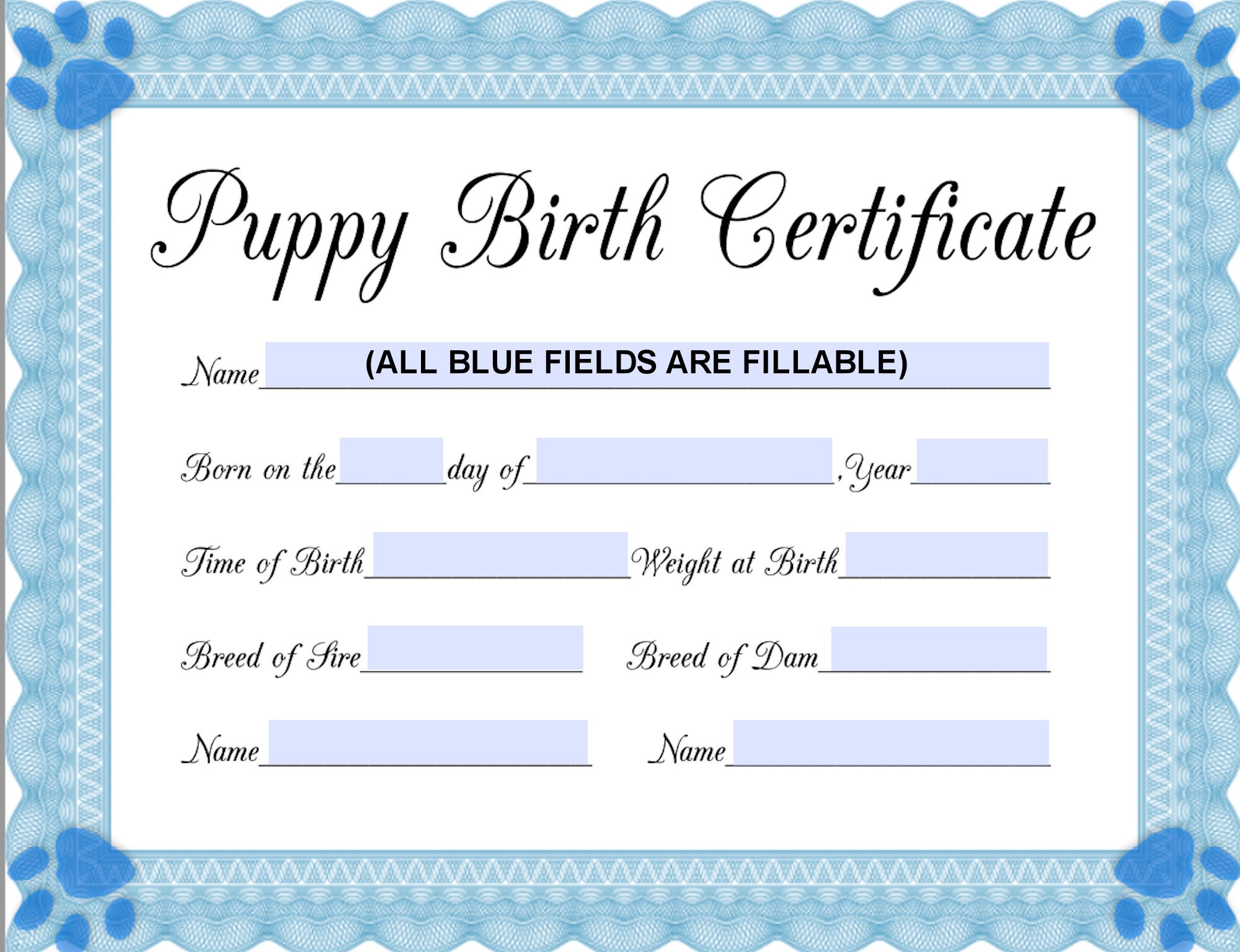 INSTANT Fillable Printable PDF Puppy Birth Certificate blue male Printable 8 5×11 4950px3825px450dpi Jpg BOTH Included Etsy Australia